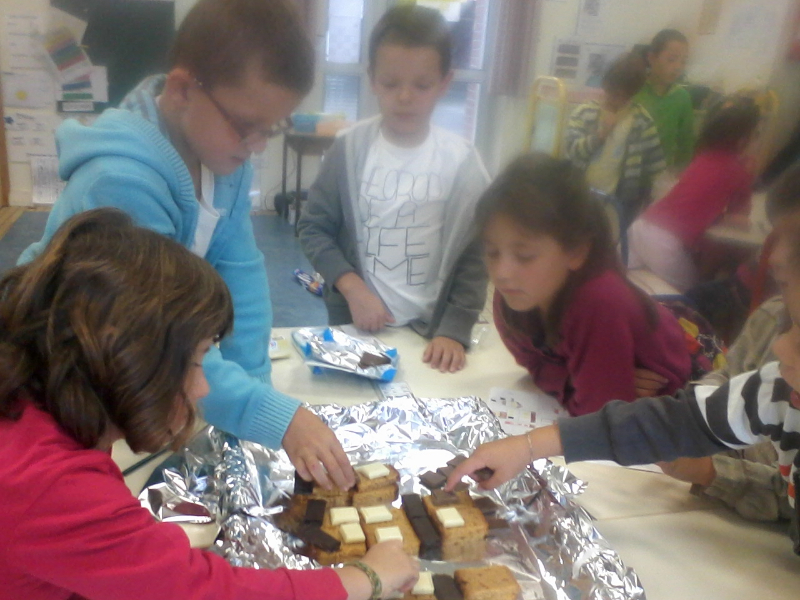 -maisons construites en pain d’ épices , biscuits , chocolats , fruits  pour accueillir les parents à notre réunion de classe qui a eu lieu le jeudi 26 septembre (gs et cp)