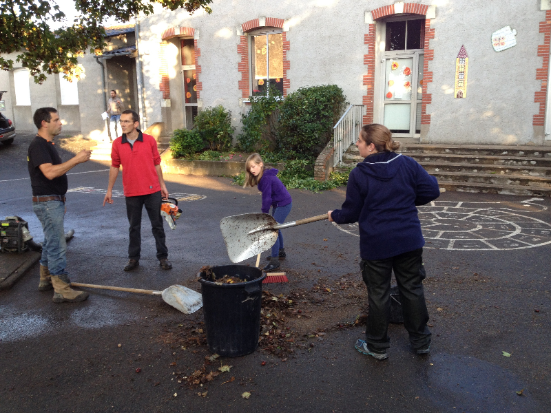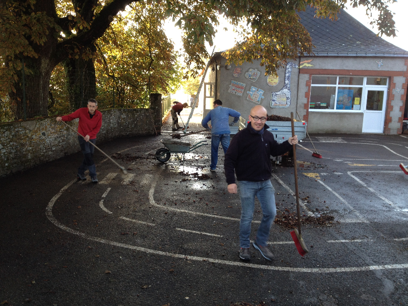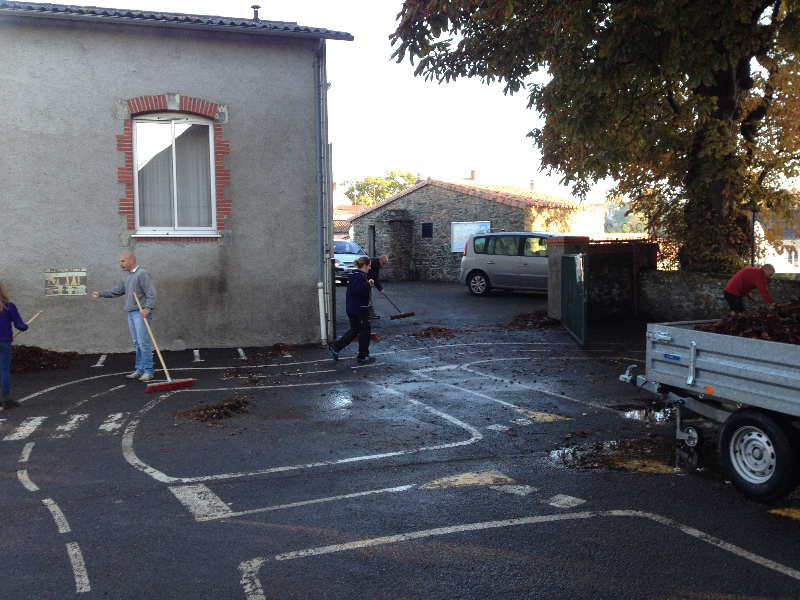 - Balayer la cour (marrons, feuilles, …) et nettoyage d’automne de l’école