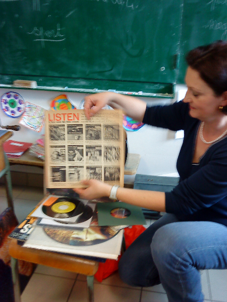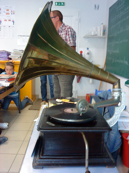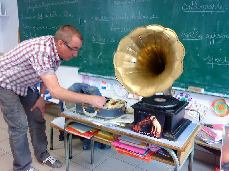 Suite à cela, Mr et Mme Minier, parents de Thibault et passionnés de musique, sont venus dans la classe pour nous présenter un gramophone, un teppaz ainsi qu’une partie de leur collection de disques vinyle. Nous avons pu écouter sur le teppaz la première chanson d’ Elvis, Madonna et bien d’autres. Les élèves ont pris connaissance de l’existence des disques 33 tours, 45 tours et 78 tours.